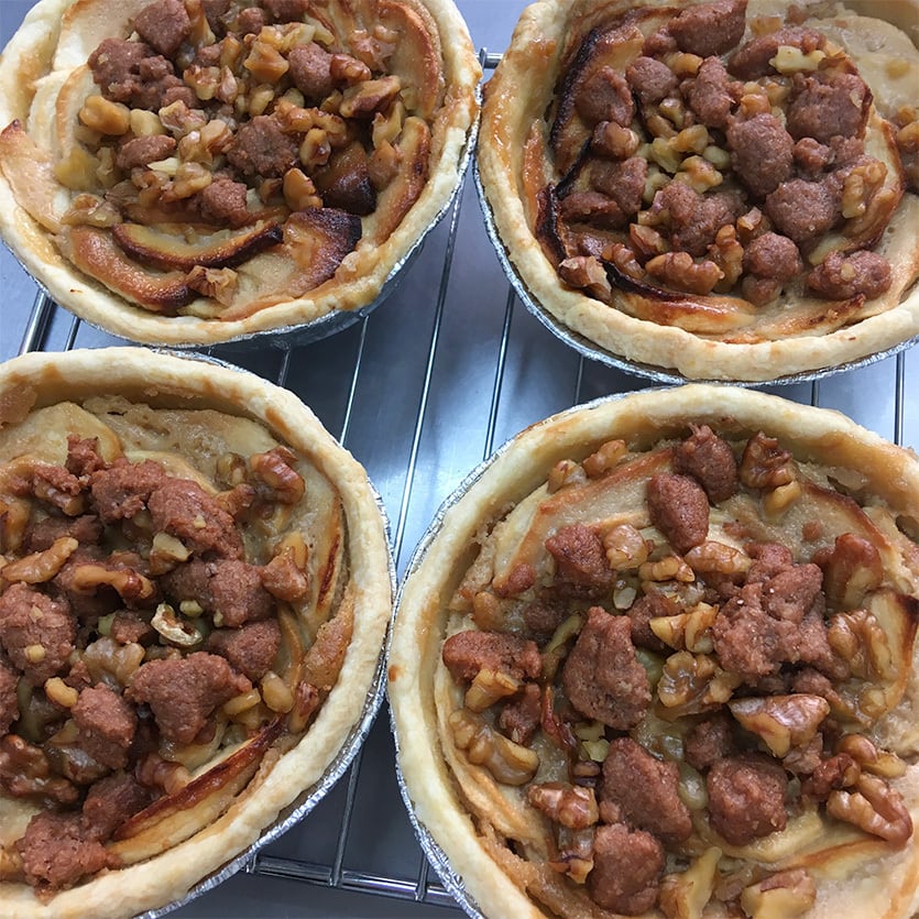 【使用材料】紅玉りんご(今回は長野産の減農薬りんごを使用しています。)、国産小麦粉、国産バター、ブラウンシュガー、サワークリーム、赤卵、オーガニックシュガー、アーモンドプードル、くるみ、シナモン、ゲラントの塩/バニラオイル