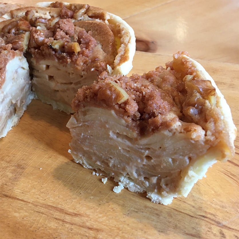 このアップルパイ、塩味の効いたアメリカンパイにスライスした生の紅玉りんごとサワークリームを使用したスペシャルソースを層にして焼き上げます。